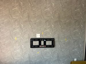 まずはふかし壁の補強位置を再確認し、お客様と相談しながら画面の高さとセンター位置を決定します。一度取り付けると修正が難しいため、レーザー水平器を使用して、ミリ単位の誤差も出ないよう慎重にマーキングを行います。