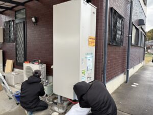 今回のエコキュート取付工事では、4人家族に適した460LタイプのMITSUBISHI製新型エコキュートを採用しました。本体は戸建家屋の裏口付近に設置し、既存機器の撤去、基礎の状態確認、配管接続、電気工事、試運転までを一括で対応しています。作業は電気工事士を含む2〜3名体制で行い、作業時間はおおよそ5〜6時間程度でした。