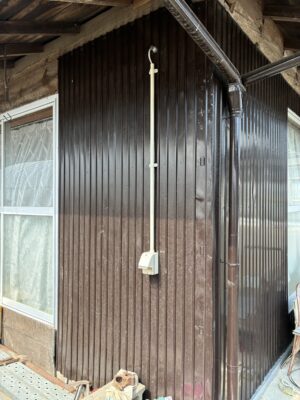「なんとか近くから電気を引っ張ってこれないかな」と一緒に建物の周りを確認して回ったところ、ちょうど取り付けを希望されている場所の真裏、建物の内側に昔使っていた古い引紐式の照明器具を見つけました。